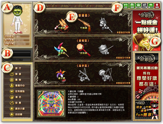 戲谷功能區(包括銀行、儲值、投票、會員中心等)。